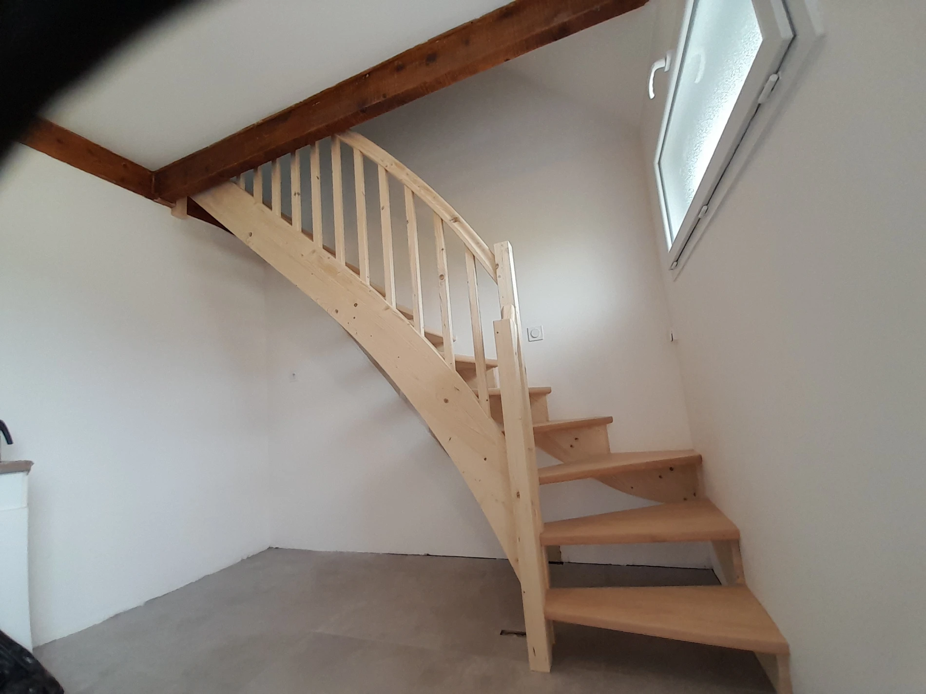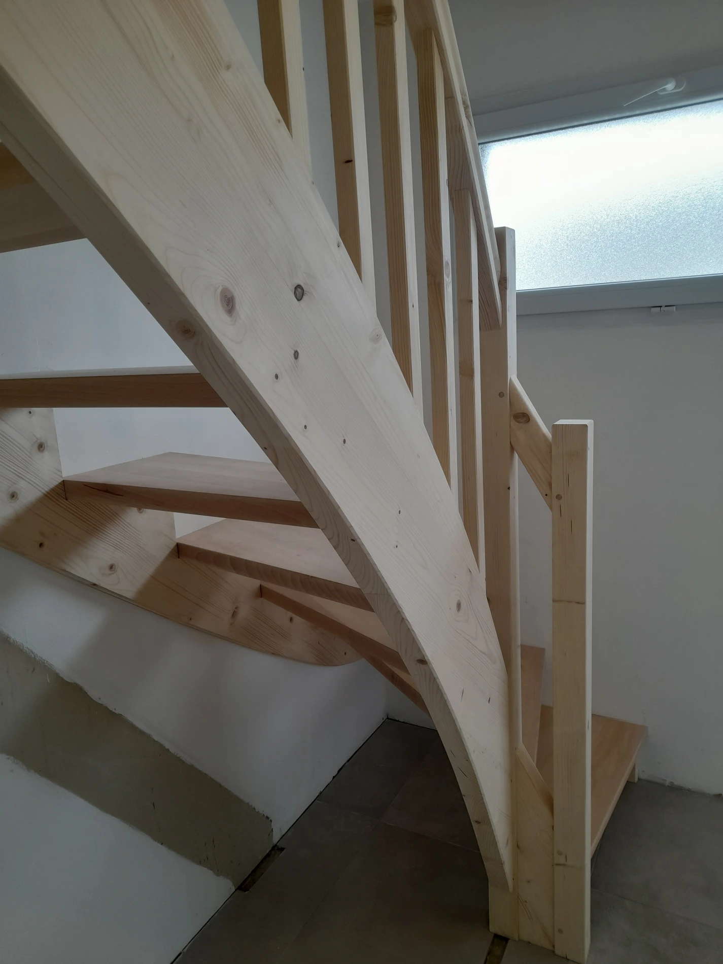 Cet escalier sur mesure un quart tournant en Epicéa et hêtre blanc a été réalisé à Pédernec (22), dans le cadre du remplacement d'une échelle meunière dangereuse.
