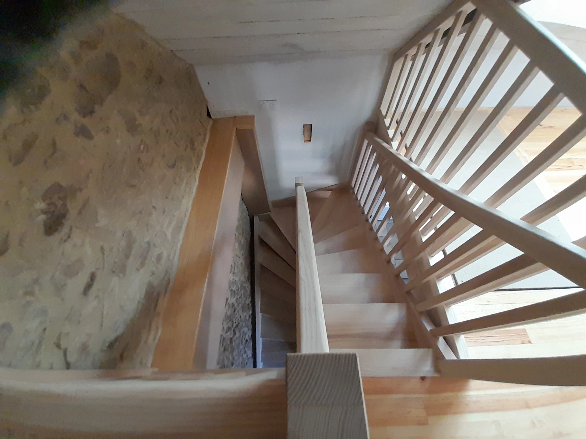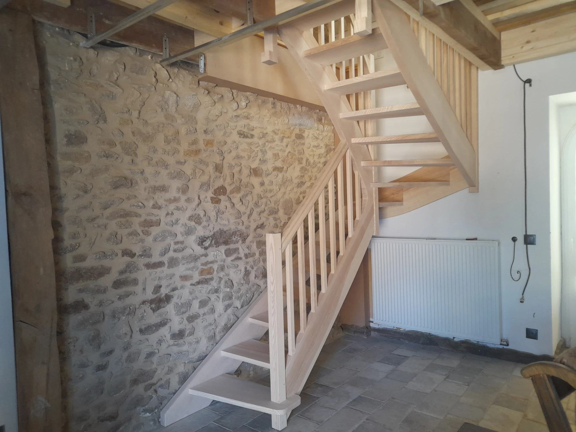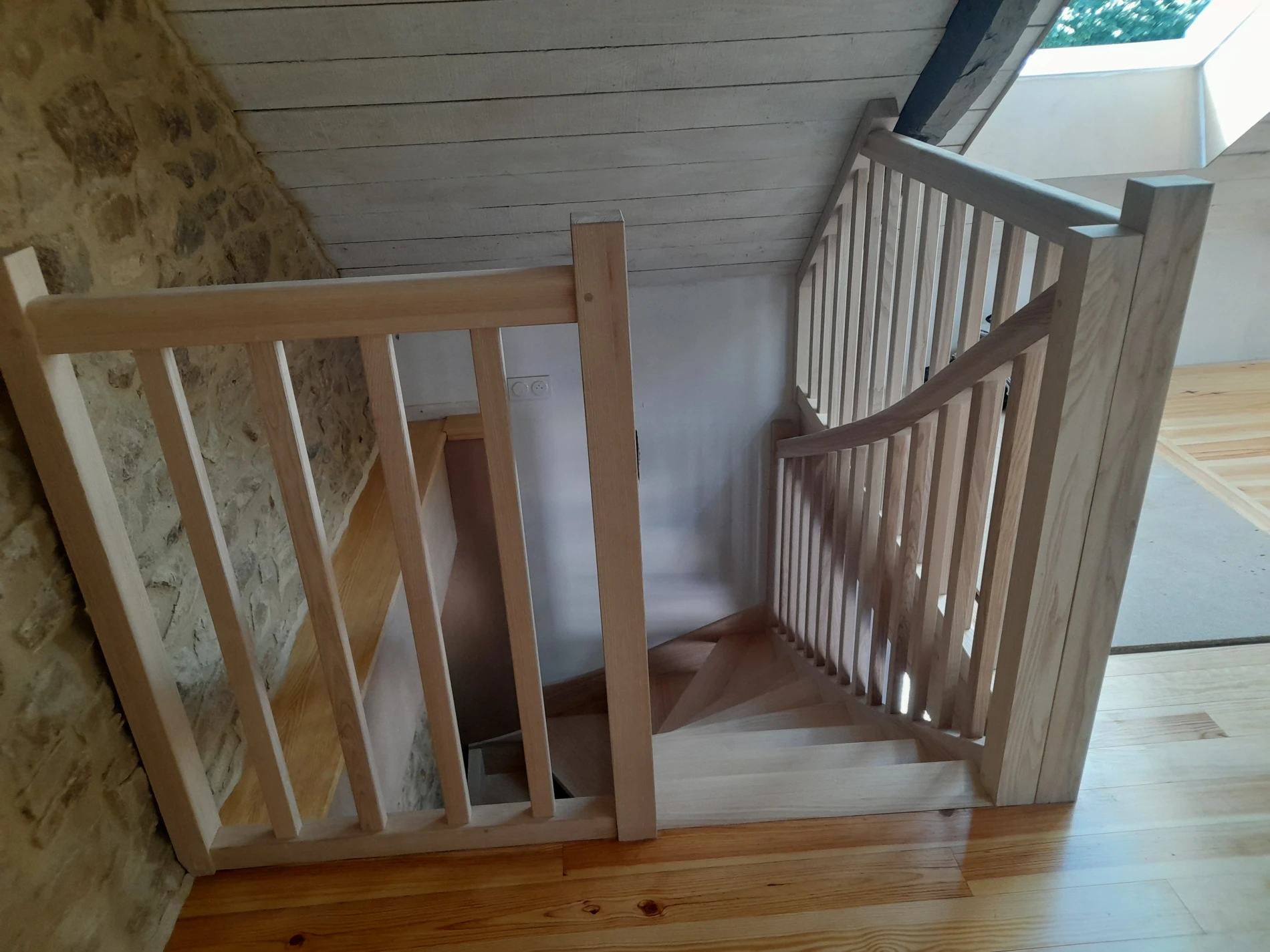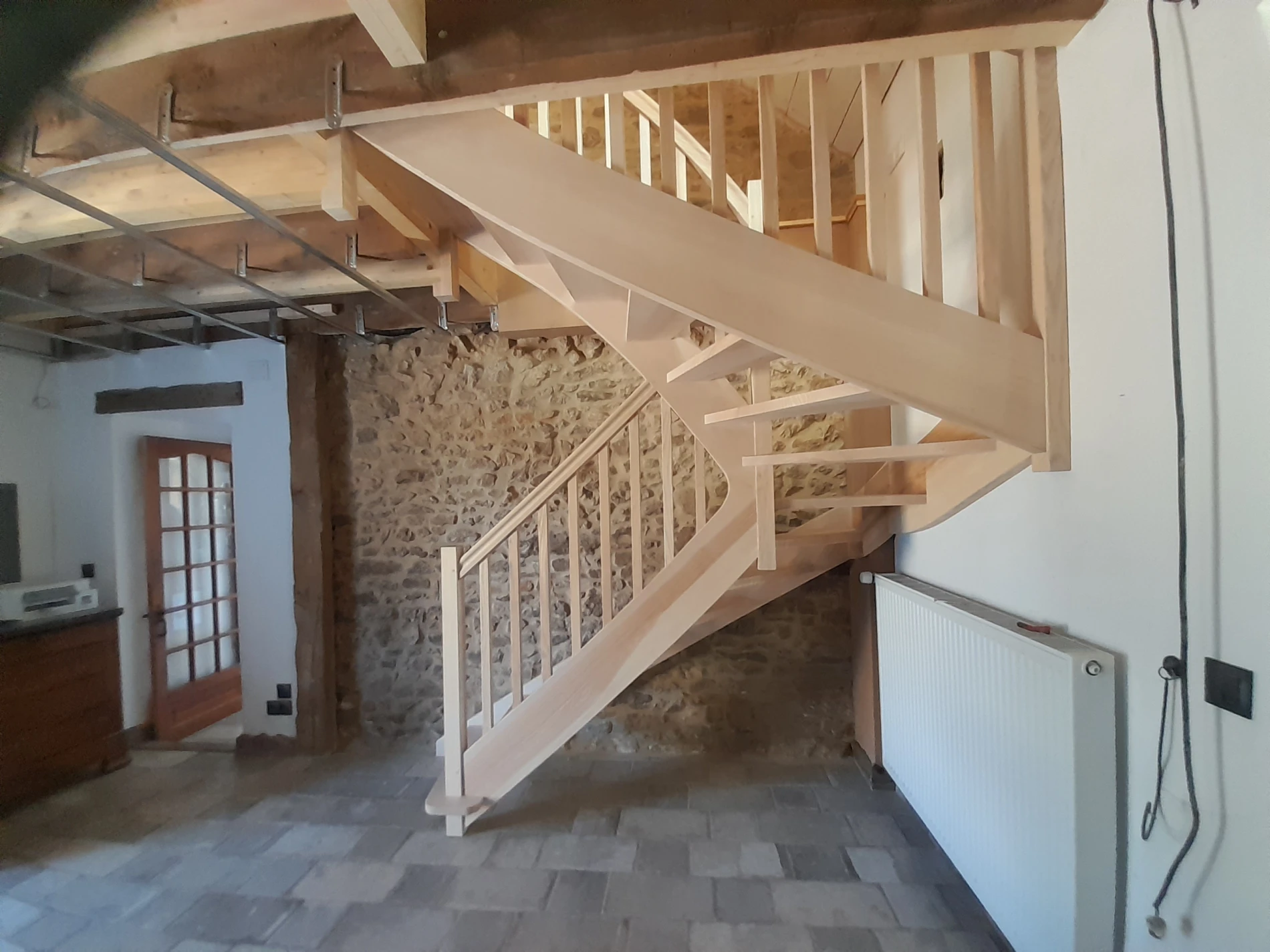 Cet escalier sur mesure deux quarts tournants en frêne Olivier a été réalisé dans le cadre de la rénovation d'un plancher dans une maison à Plésidy (22).
