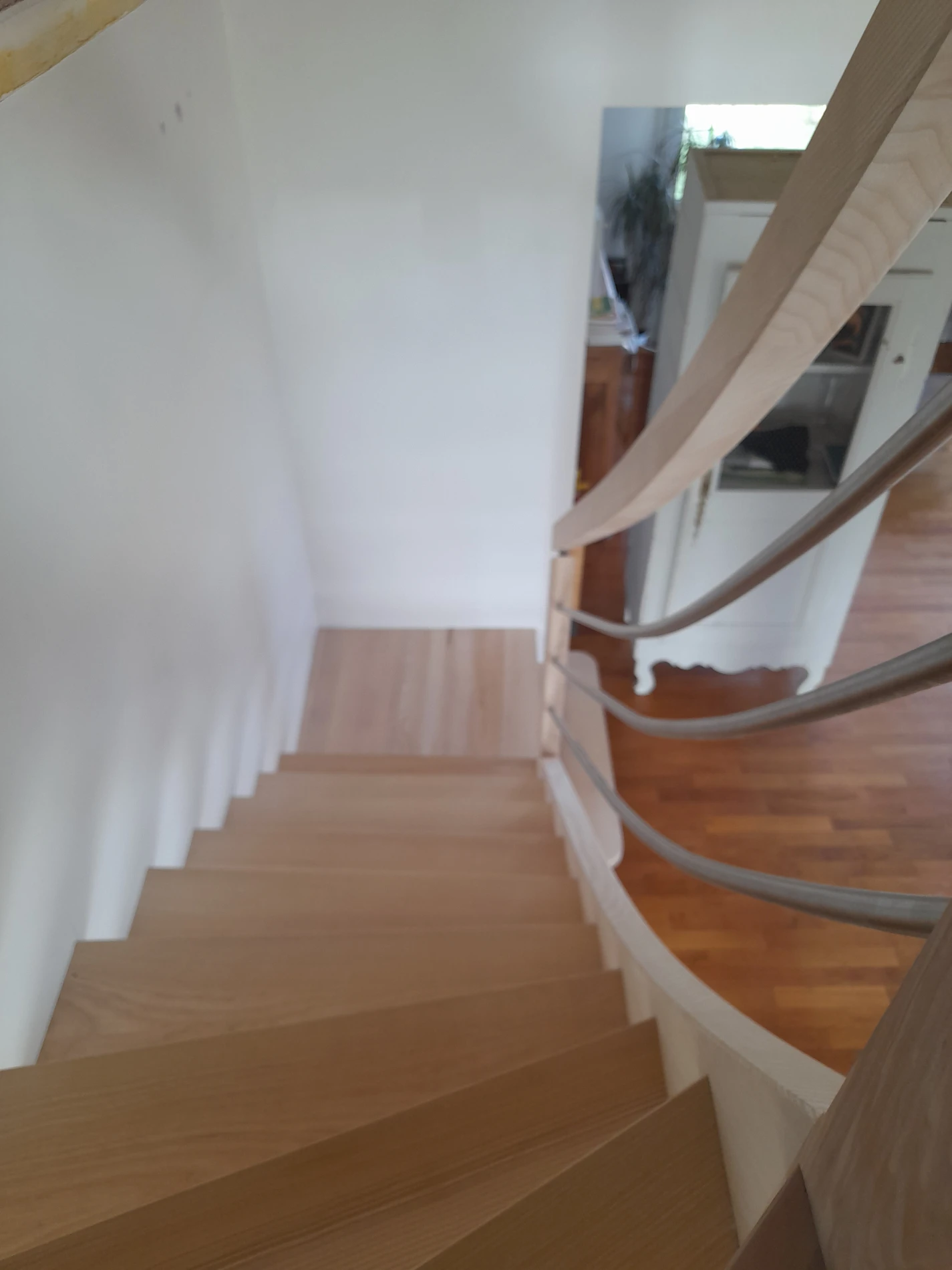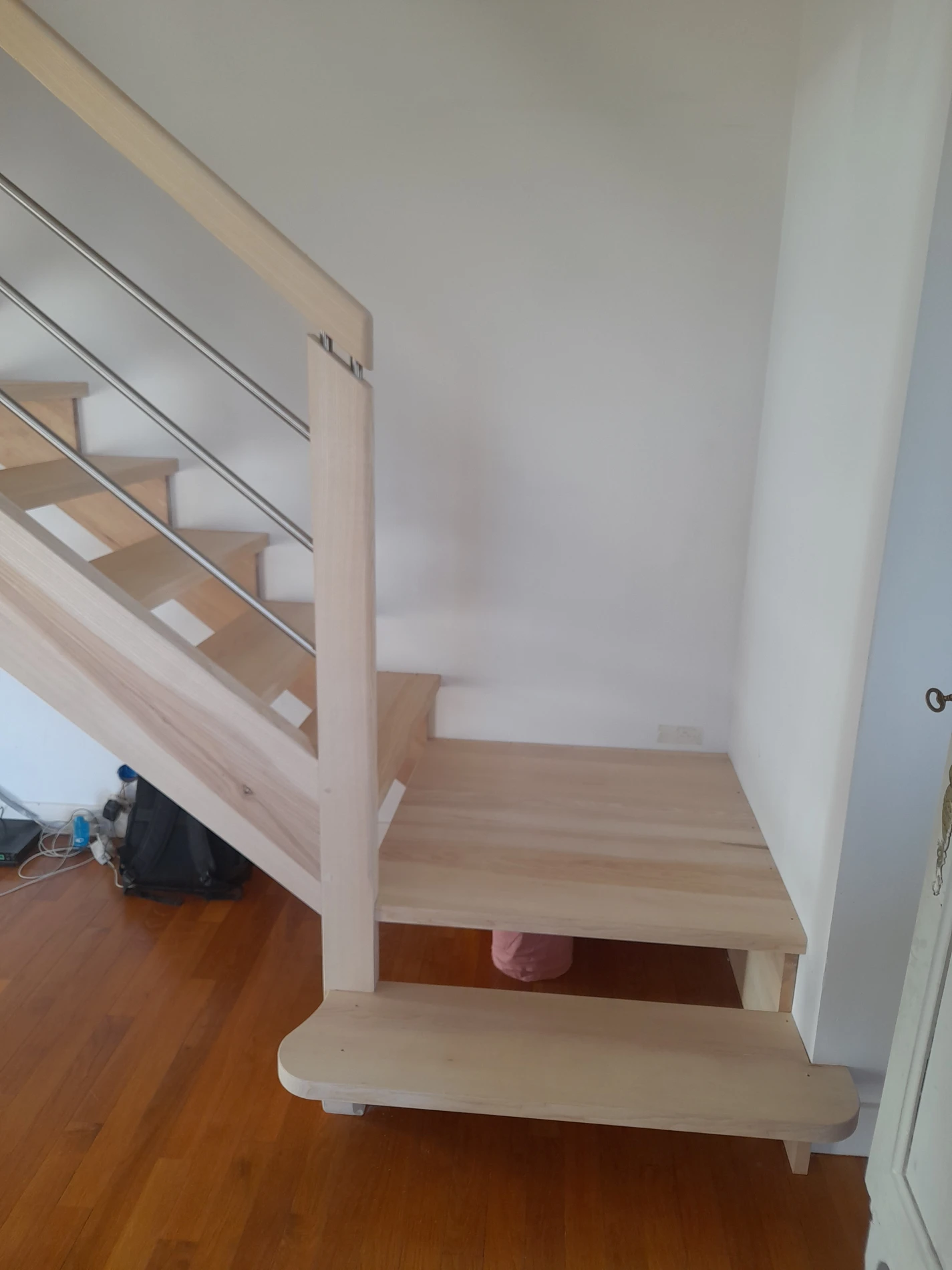 L'absence de contremarche et la suspension des poteaux lui donnent un aspect de légèreté, respectant ainsi les perspectives existante. Le premier quart tournant sur palier donne en départ accueillant et en douceur.