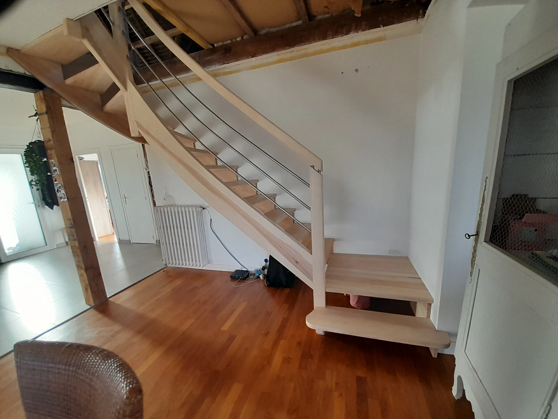 Cet escalier sur mesure deux quarts tournants en frêne Olivier a été réalisé dans le cadre de l'aménagement des combles d'une maison Néo-bretonne à Lannion (22).